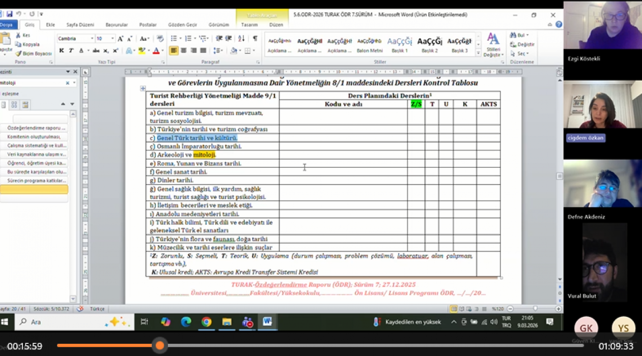 Ayvacık Meslek Yüksekokulu, Turist Rehberliği Programı'nın TURAK akreditasyon başvuru süreci kapsamında kalite güvence ve sürekli iyileştirme faaliyetlerini sürdürüyor. 9 Mart 2026 tarihinde Doç. Dr. Defne Akdeniz başkanlığında çevrimiçi olarak gerçekleştirilen toplantıda, programın eğitim kalitesini artırmaya yönelik kritik kararlar alındı.