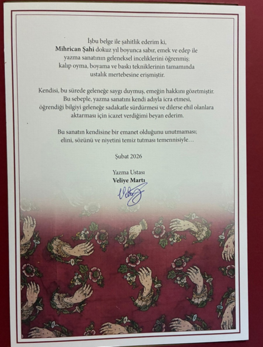 Ayvacık Meslek Yüksekokulu Geleneksel El Sanatları Programı mezunumuz Mihrican Şahi, geleneksel sanatlarımızdan yazmacılık alanında önemli bir başarıya imza attı. Mezunumuz, yazmacılık sanatında ustalığını belgeleyerek, bu alanda değerli çalışmalarıyla tanınan usta sanatçı Veliye Martı’dan icazet aldı.