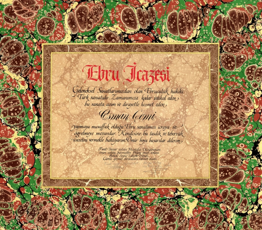 Türk ebru sanatının duayen isimlerinden Fuat Başar’ın sanat hayatının 50. yılına ithafen hazırlanan Fuadnâme sergisi kapsamında düzenlenen törende, mezunumuza Ebru İcazeti takdim edildi.