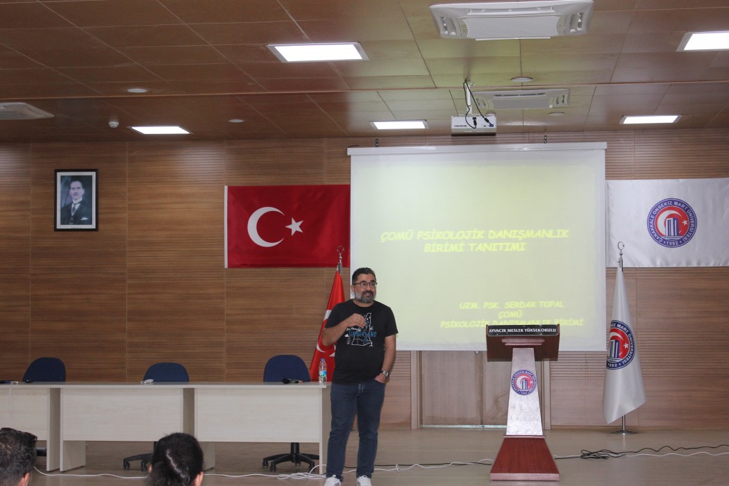 Çanakkale Onsekiz Mart Üniversitesi Psikolojik Danışma ve Rehberlik Biriminde görevli Uzman Psikolog Serdar TOPAL, yüksekokul öğrencilerimize "Üniversite Yaşamına Uyum" konulu bir seminer verdi. Seminere akademisyenler ve öğrenciler katıldı.